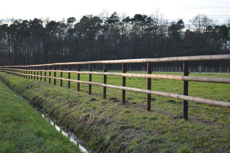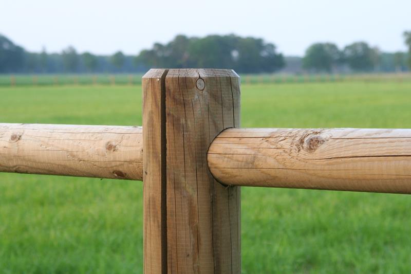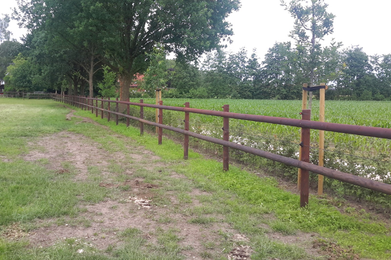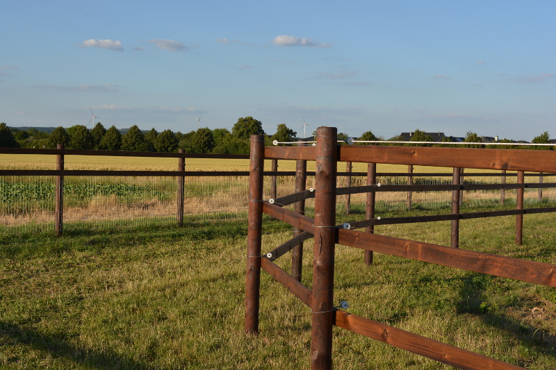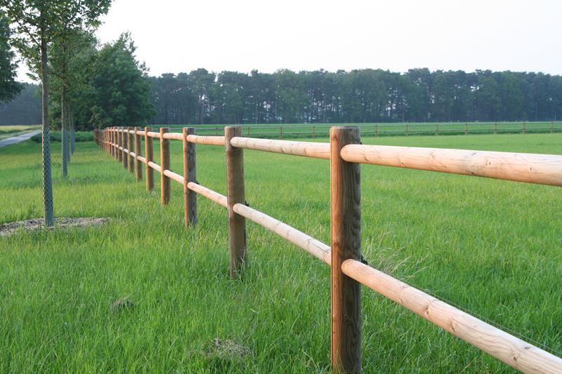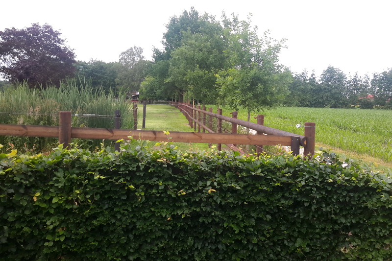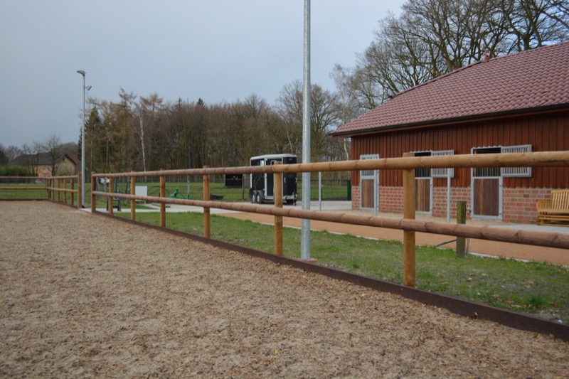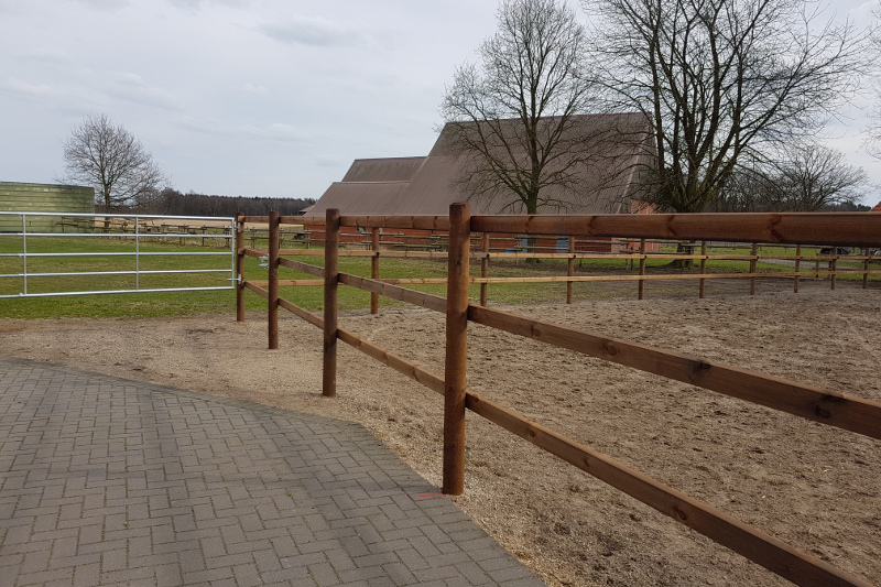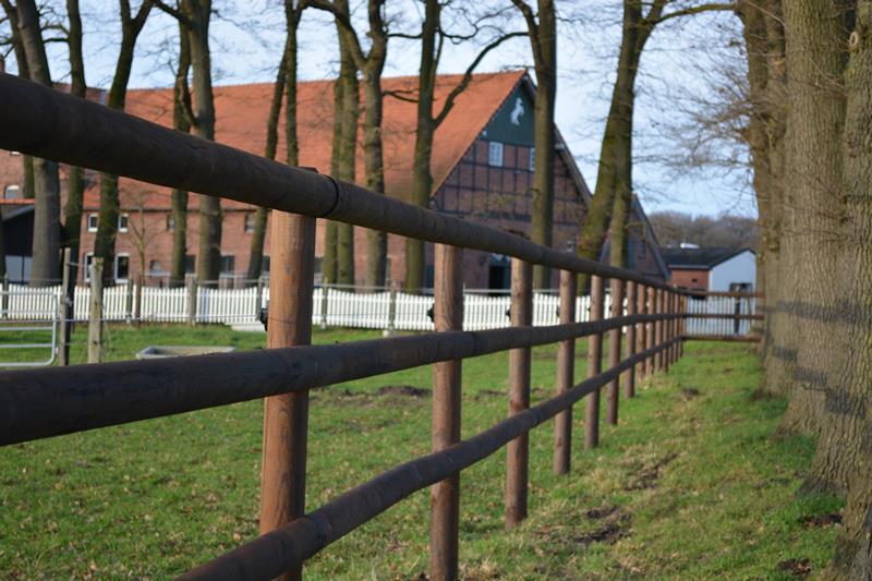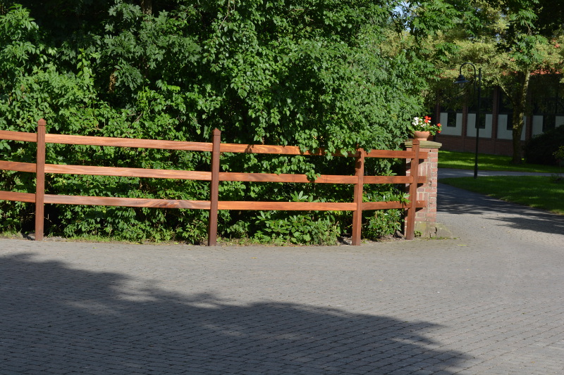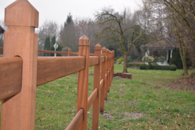 Holzzaun aus qualitativ hochwertiger Kiefer, rund in rund gearbeitet, Riegel werden durch den Pfosten gesteckt und unsichtbar verschraubt.