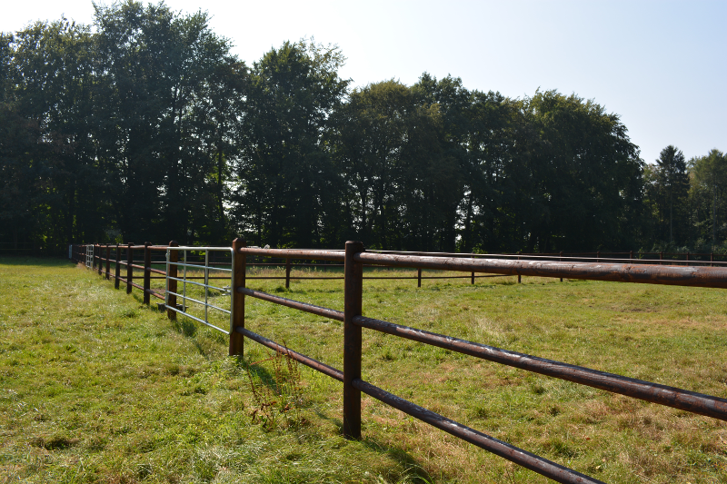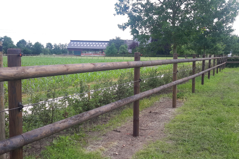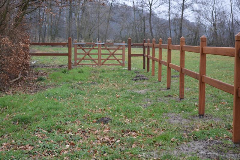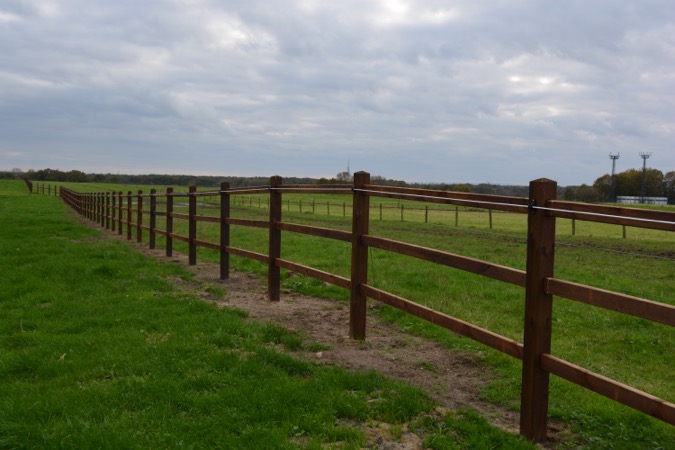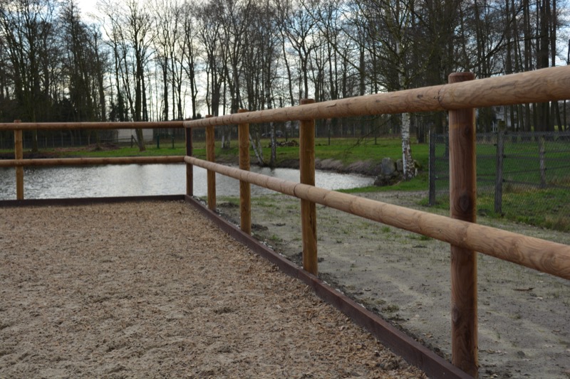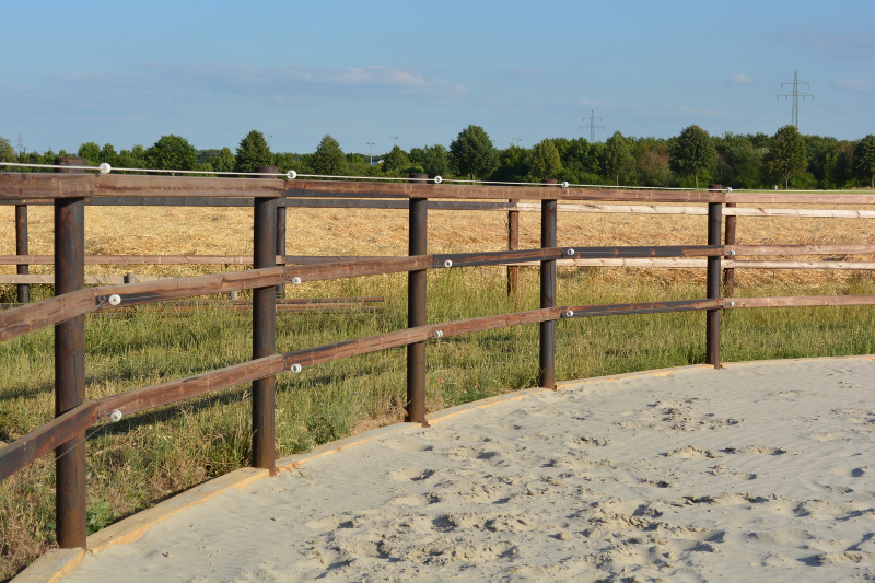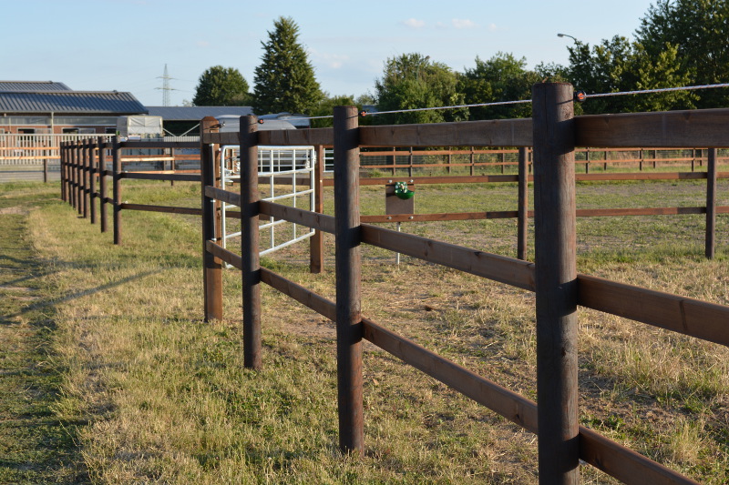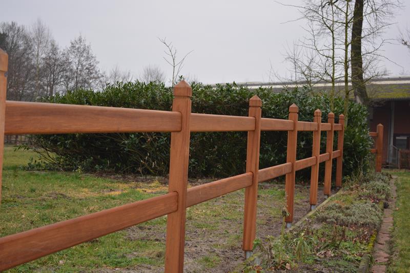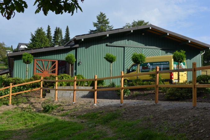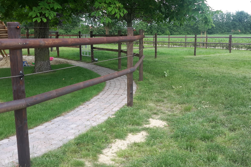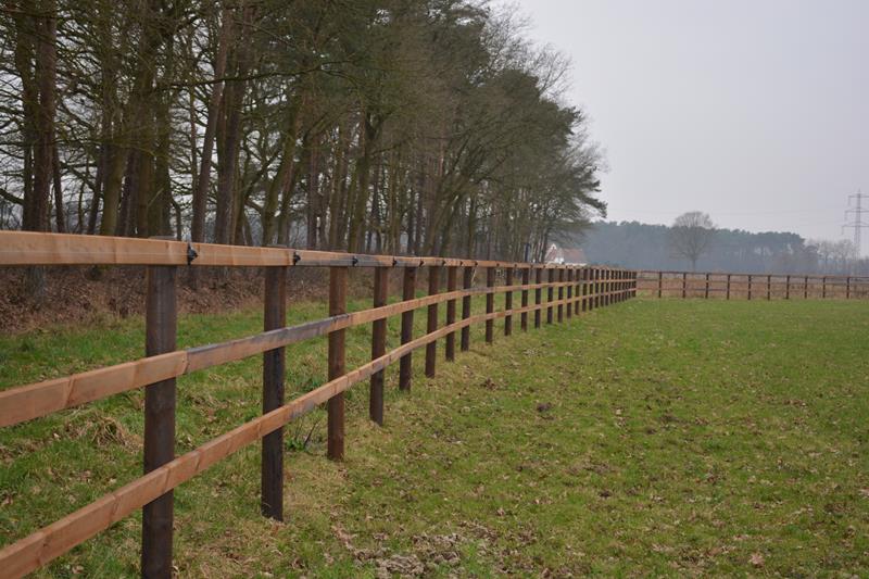 Holzzaun aus qualitativ hochwertiger Kiefer, rund in rund gearbeitet, Riegel werden durch den Pfosten gesteckt und unsichtbar verschraubt.